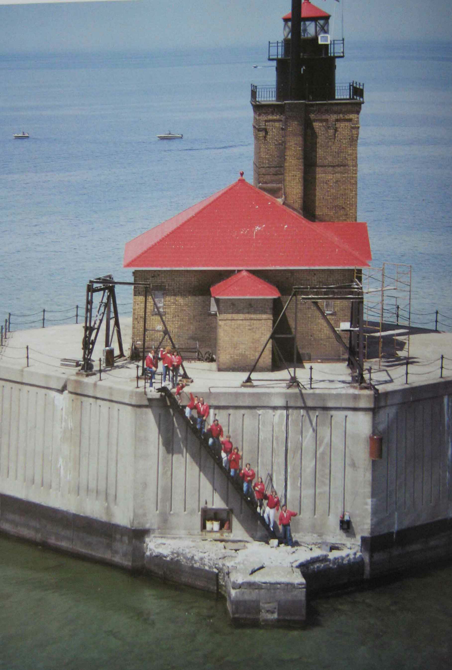 In 1988, many of those friends and residents formed the Port Austin Reef Light Association, Inc. (PARLA), an association dedicated to the restoration and maintenance of the Port Austin Reef Light Station. Mr. Schillinger served as its first president. In 1988 PARLA began making significant steps toward its goals. The original access ladder, located on the reef some distance from the light station, was reattached. Subsequently, all the steps that had been missing were located on the reef and reattached making convenient access to the lightstation possible. That year, Mr. Schillinger, with the support of PARLA, was able to extend the license to 2020. This allowed PARLA to manage and restore the property on Mr. Schillinger’s license until an organizational lease could be arranged. In order to maintain the license, the biggest task was to build a functional roof on the fog signal building. PARLA installed a roof truss system which closely matched the original historic roof pitch and profile. The roof is clad with historically accurate red metal shingles.